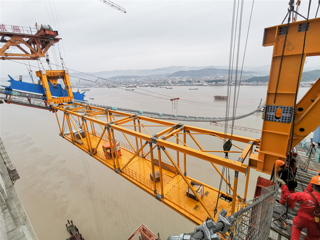 温州瓯江北口大桥项目是甬台温高速公路复线和温州市南金公路两大项目跨越瓯江的控制性工程。项目全长约7.9公里,其中跨瓯江的主桥长2.09公里,采用主跨2×800米的三塔双层桥面钢桁梁悬索桥结构,共有钢桁梁110个节段,吊装总重量约8万吨,其中单节钢桁梁最大重量达813吨,采用吊重1000吨的缆载吊机进行吊装,这是目前世界吊重能力最大的缆载吊机。