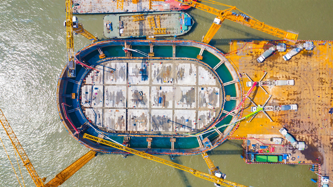 大桥5号墩主塔采用“钢-混”混合结构空间钻石形桥塔,其承台平面尺寸长77米、宽39.8米,面积比7个标准篮球场还大。承台中心最高点设计高度约8米,自下而上共分3次浇筑,共需混凝土约2万立方米,面临混凝土体积巨大、预埋件多、钢筋密度非常高、振捣难度大、温控养护技术复杂等难题。5号墩主塔承台和塔座预计6月底完成全部施工,届时将正式迈入世界最高桥塔塔身施工阶段。