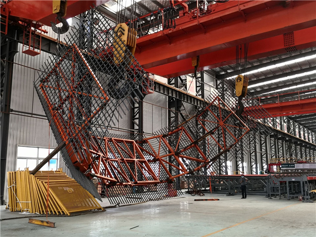 经过两个月的勠力奋战,生产线终于可以正式稳定生产,一根根钢筋就这样在流水线中“乖乖排列”,成为一张张井然有序的钢筋网片。平面钢筋网片尺寸长约20米、宽6米,立体弯折成型后,钢筋网片单张最大尺寸长14.7米、宽7米、高6米,最大重量近11吨,是理所当然的“大块头”。