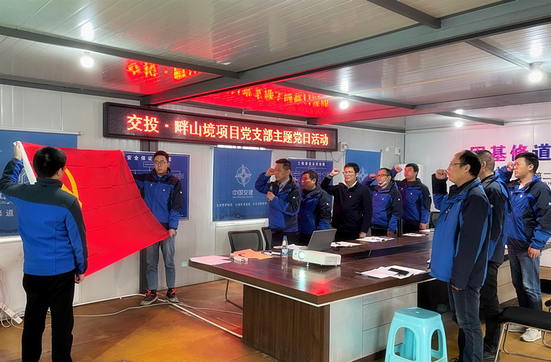 “我志愿加入中国共产党,拥护党的纲领,遵守党的章程,履行党员义务……”这是3月16日,中交二航局交投·畔山境项目部党支部主题党日活动中党员重温入党誓词的一个镜头。