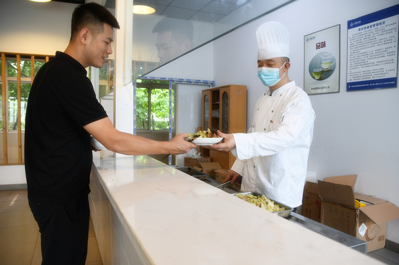 “一个餐盒3角钱,一份盒饭汤、菜、饭需要三个餐盒,1人1天两餐需要6个,目前平均每天30人送60份,4年工程要花7万多元买餐盒。如果人均发一个保温饭盒,不仅饭、菜、汤分开不窜味,还经济环保。”面对勇哥的“上门算账”,项目书记姚春宇频频点头并竖起大拇指:“大厨,你‘食’在专业!”